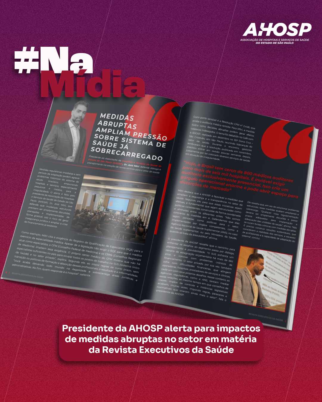 O presidente da Associação de Hospitais e Serviços de Saúde do Estado de São Paulo (AHOSP), Dr. Anis Mitri, destacou os riscos de decisões implementadas sem período de transição para um sistema de saúde já sobrecarregado. Entre os pontos abordados estão a exigência do Registro de Qualificação de Especialista (RQE) e a proibição da auditoria médica remota, que podem gerar insegurança jurídica e ampliar a pressão financeira sobre hospitais, especialmente os de pequeno e médio porte.
